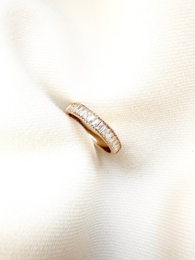 Son design minimaliste met en valeur une ligne délicate de zircons blancs lumineux, taillés en baguette et sertis avec finesse. Fine et raffinée, elle évoque la pureté et la continuité, comme une promesse qui traverse le temps.